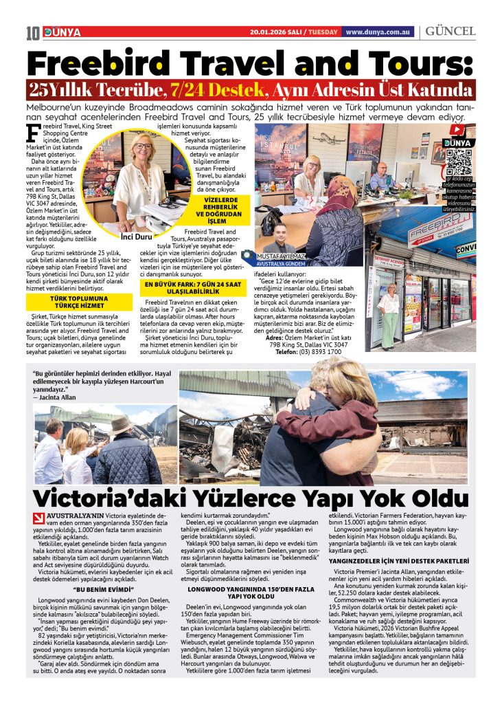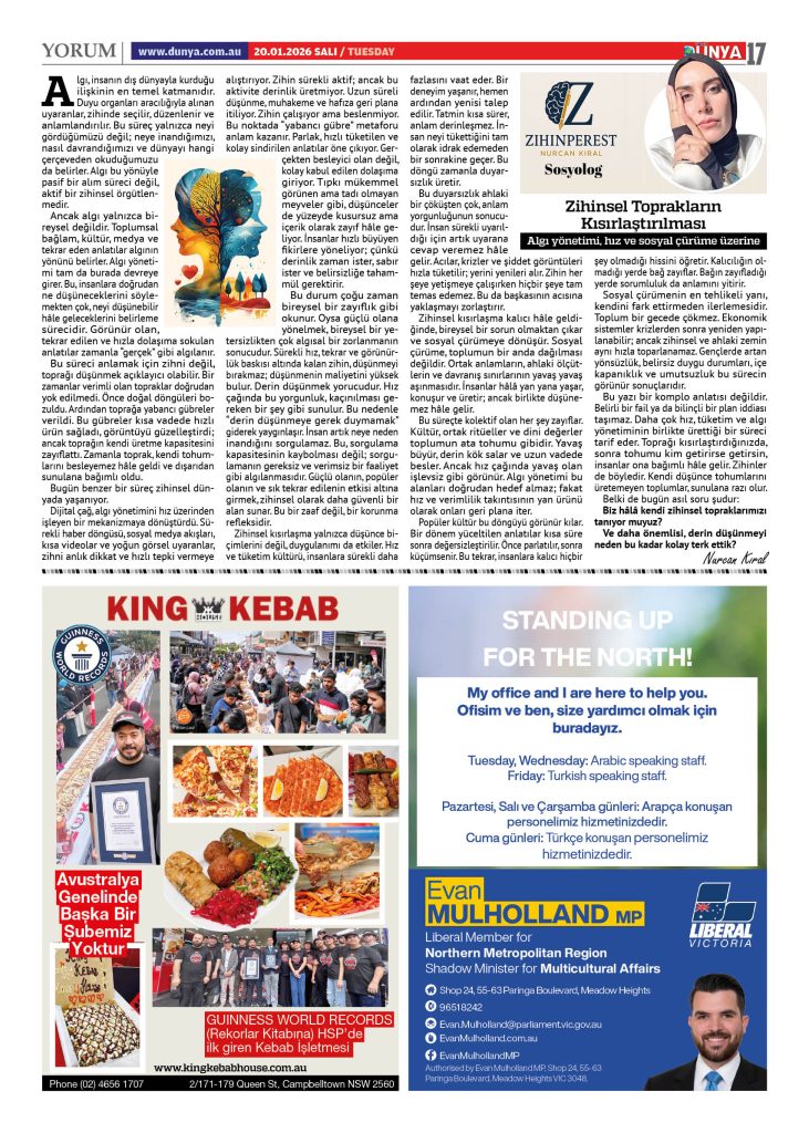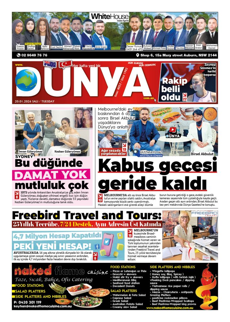 Dünya Gazetesi – 20 Ocak 2025 sayısı dijital olarak da yayında! Baskılı gazeteye Melbourne ve Sydney’in seçkin mekanlarından ulaşabilirsiniz.
