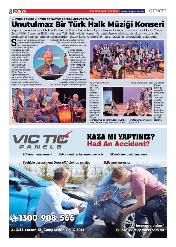 Yaşama sevinci ve umut kokan türküler, 16 Kasım Cumartesi akşamı Penola College salonunda yankılandı. Yunus Emre Kültür Sanat ve Eğitim Merkezi, Türk Halk Müziği Konseri ile izleyicilere unutulmaz bir akşam yaşattı. Hem profesyonel hem de amatör sanatçılardan oluşan koro, Anadolu’nun eşsiz türkülerini dinleyicilerle buluşturdu.