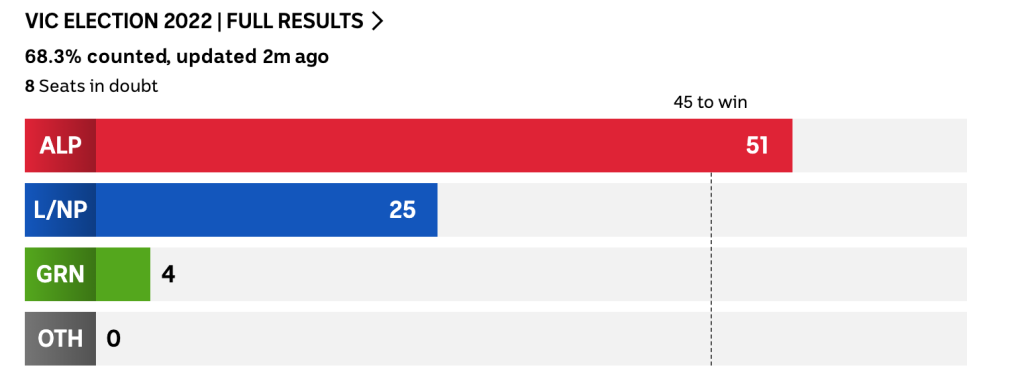 ABC’nin seçim bilgisayarı, Esrarı Yasallaştır partisinin (The Legalise Cannabis) Güney Doğu Metropolitan ve Batı Metropolitan bölgesinde iki üst meclis koltuğu kazanma yolunda olduğunu da tahmin ediyor.
