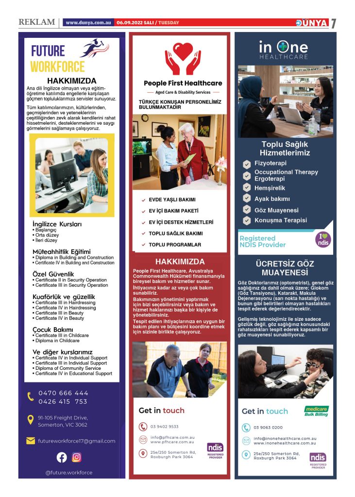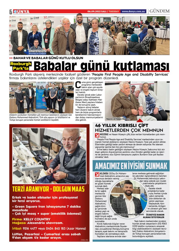 Yaşlı bakım merkezinden ücretsiz hizmet almak isteyenlerin (03) 9063 0200 telefon numarasını arayarak bilgi alabileceklerini söyleyen tecrübeli Doktor Alebrahimi, bünyelerinde Türkçe konuşan personellerinde bulunduğunu açıkladı.