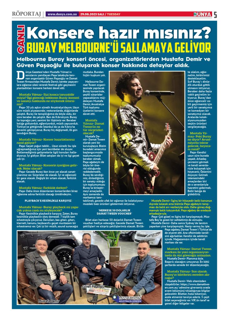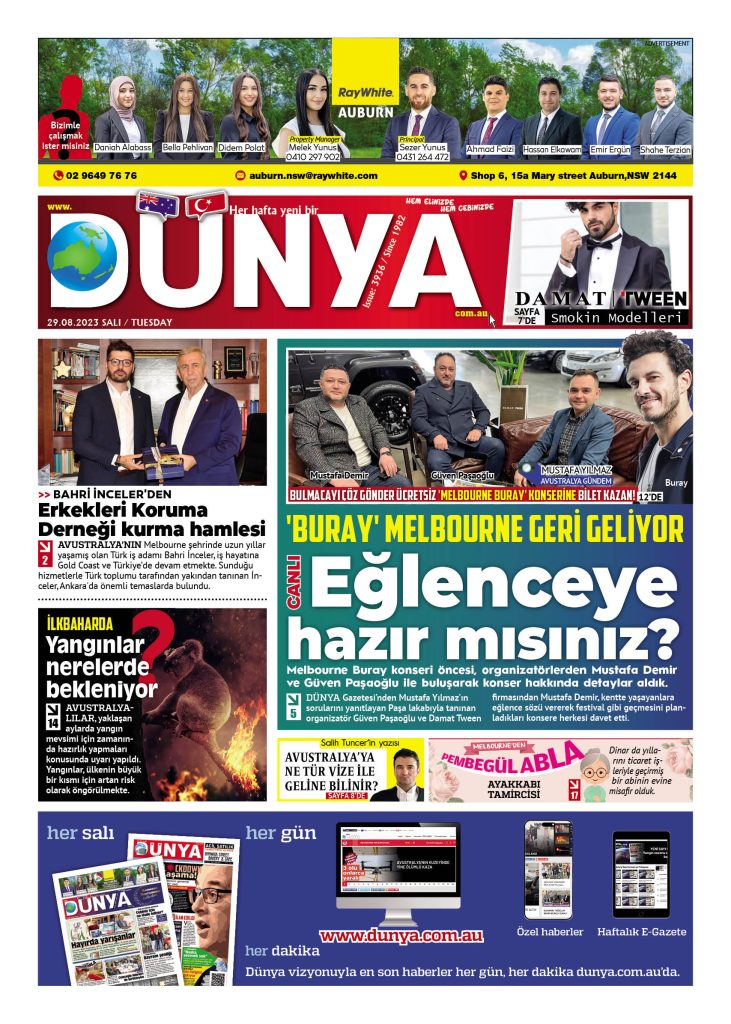Dünya gazetesinin 29 Ağustos 2023 tarihli yeni sayısı çıktı. Gazeteye Melbourne ve Sydney’in seçkin mekanlarından ulaşabilirsiniz.
