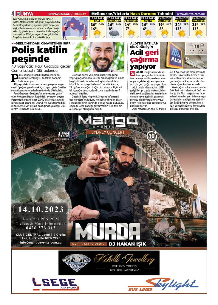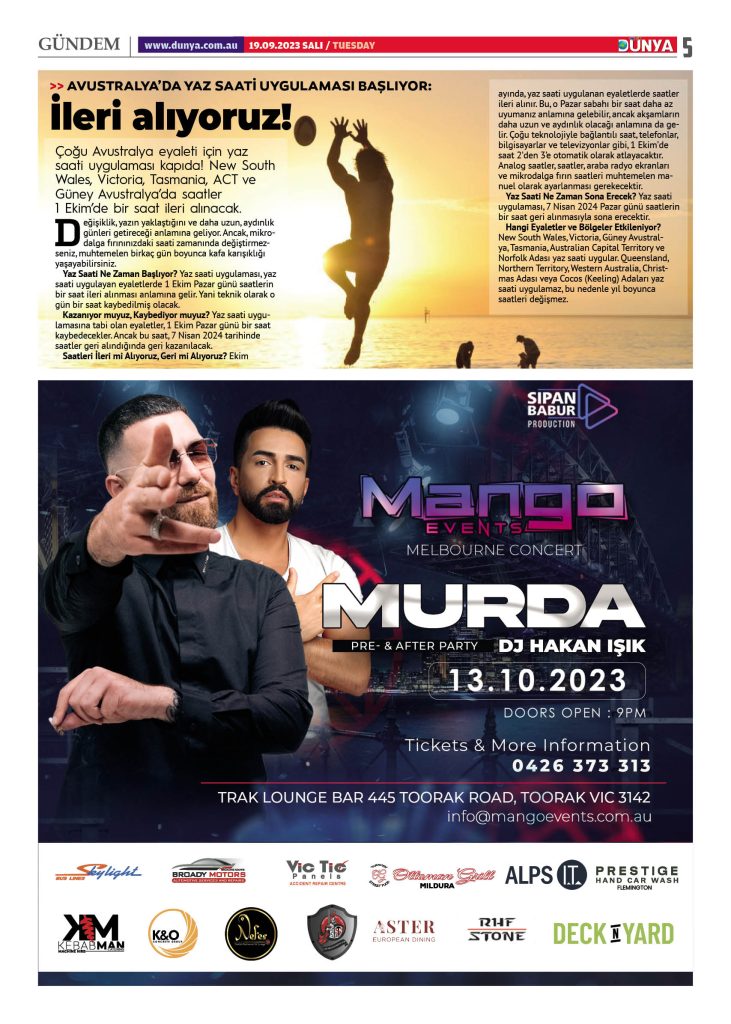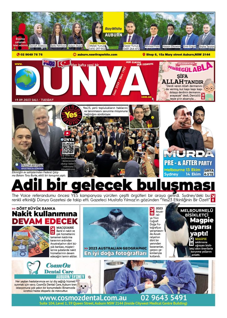 Dünya gazetesinin 19 Eylül 2023 tarihli yeni sayısı çıktı. Gazeteye Melbourne ve Sydney’in seçkin mekanlarından ulaşabilirsiniz.