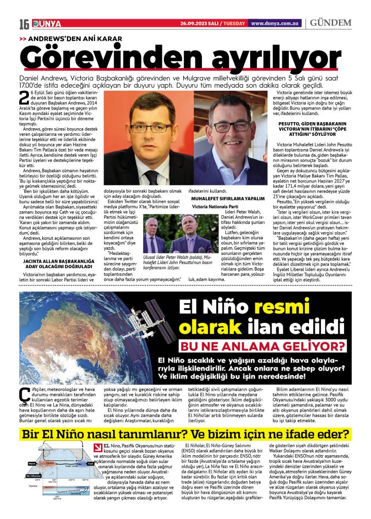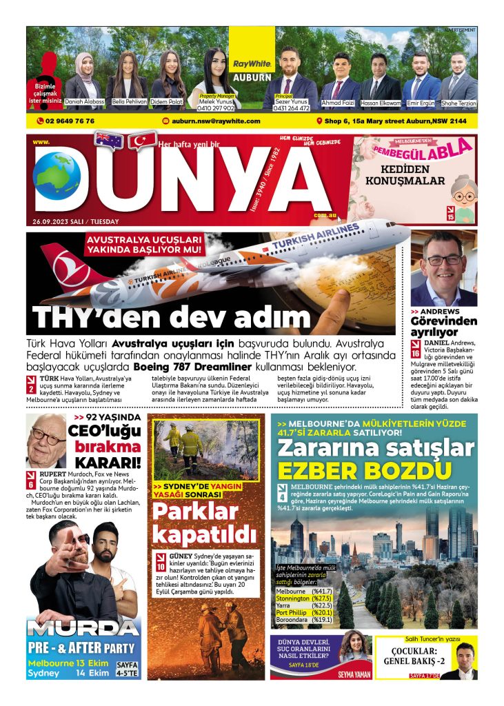 Dünya gazetesinin 26 Eylül 2023 tarihli yeni sayısı çıktı. Gazeteye Melbourne ve Sydney’in seçkin mekanlarından ulaşabilirsiniz.