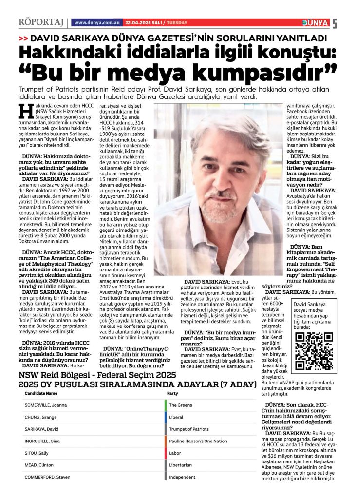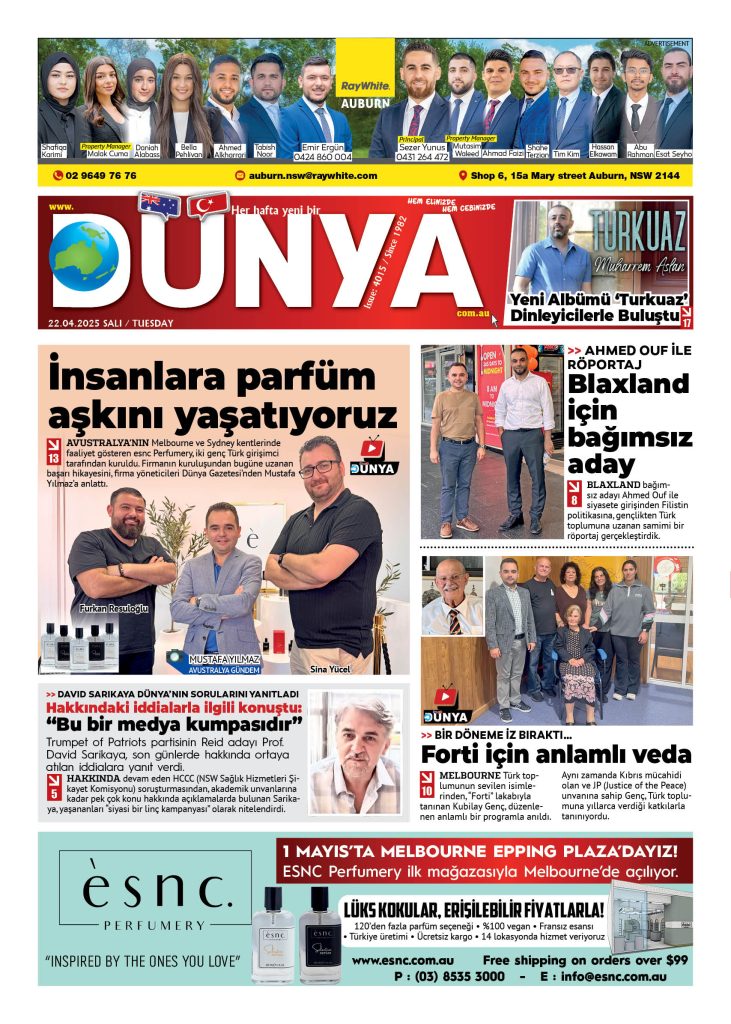 Dünya Gazetesi’nin 22 Nisan 2025 tarihli yeni sayısı çıktı. Melbourne ve Sydney’deki seçkin noktalardan basılı gazete nüshasına ulaşabilirsiniz.