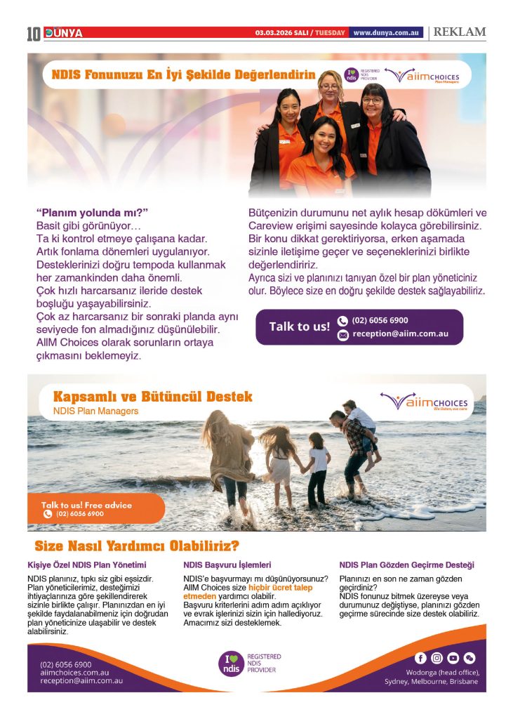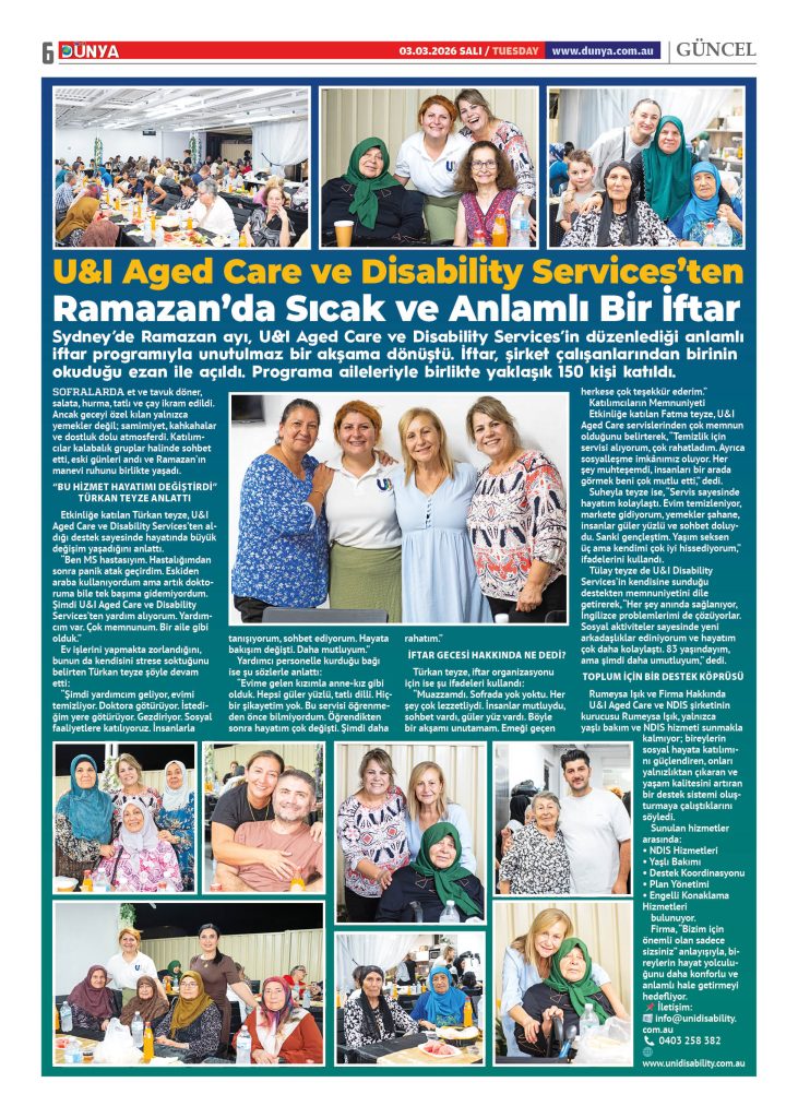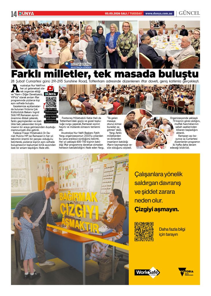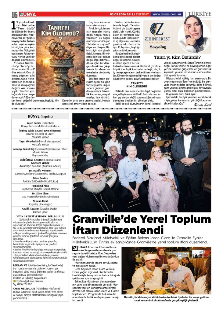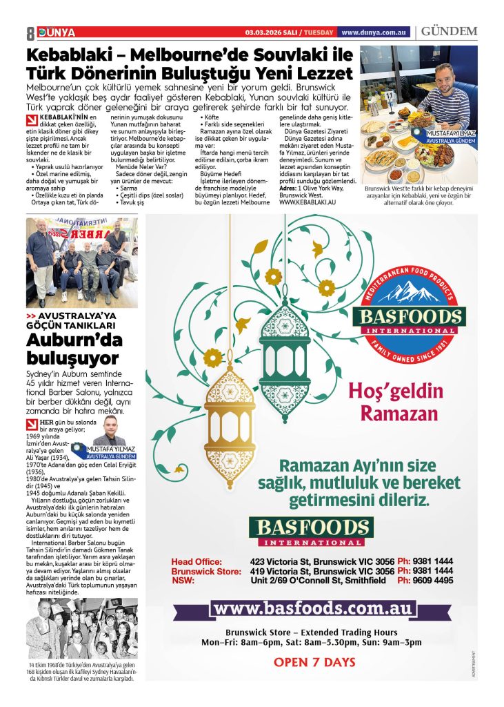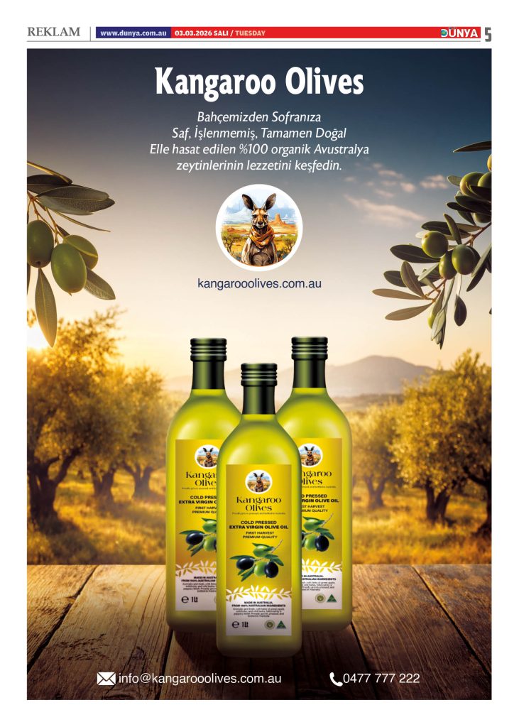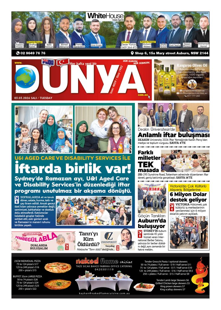 Dünya Gazetesi – 3 Mart 2026 sayısı dijital olarak da yayında! Baskılı gazeteye Melbourne ve Sydney’in seçkin mekanlarından ulaşabilirsiniz.
