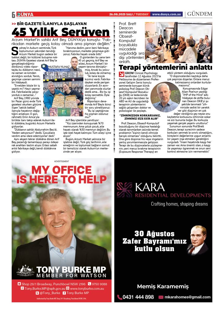 MELBOURNE– GROW Clinical Psychology tarafından 12 Ağustos 2025’te Melbourne da düzenlenen Profesyonel Gelişim Serisi konulu seminerde konuşan klinik psikolog prof Deacon Obsesif-Kompulsif Bozukluğu (OKB) ve tedavisinde 20 yılı askin tecrübesiyle ABD ve AU da uyguladığı terapinin yöntemlerini sağlık çalışanları doktor ve psikologlar ile paylaştı.